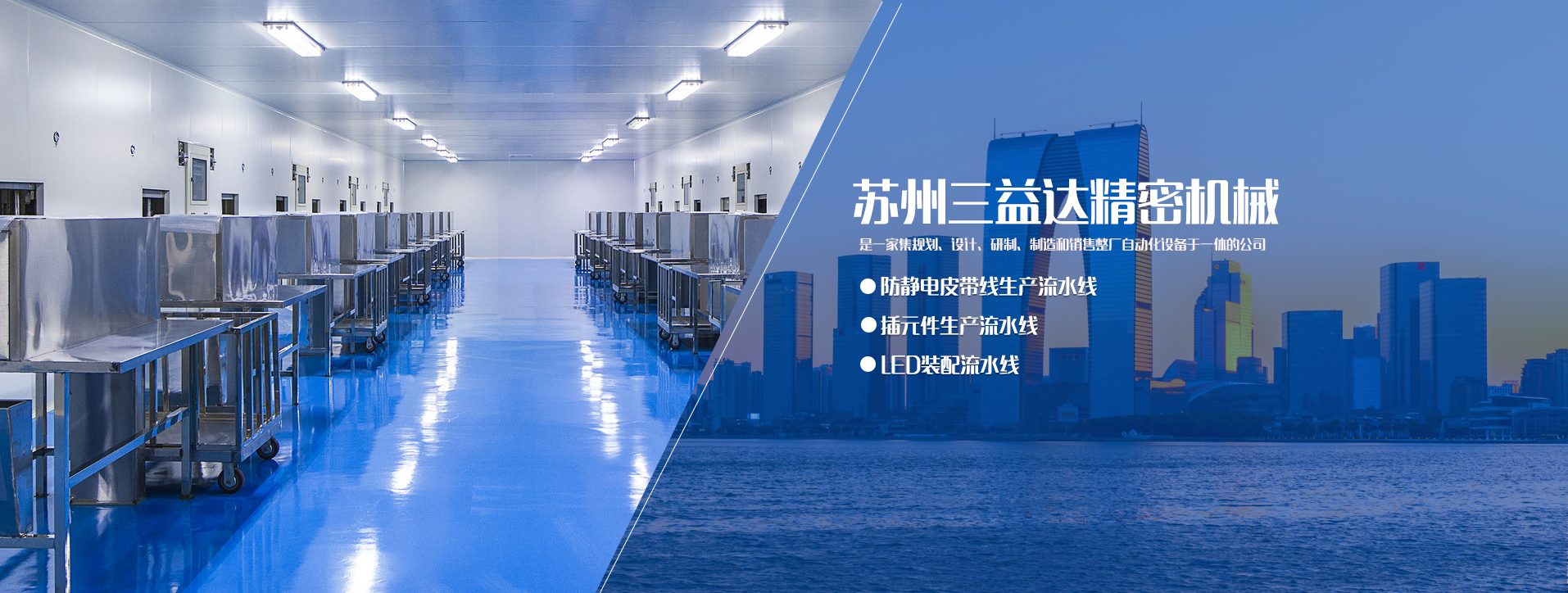 蘇州三益達精密機械有限公司,成立于2006年,是一家集規劃、設計、研制、制造和銷售整廠自動化設備于一體公司。產品主要有流水線,插件線,皮帶線,自動插件線、PVC平面輸送線、家電組裝線、老化線、波峰焊接生產線以及各種相關電子設備。同時還承接工廠自動化改造工程。公司擁有一支穩定而高素質的研發生產技術隊伍,引進國際上的加工設備,精密的檢測儀器和生產研發理念、從設計、加工到試產每一個環節都力求精而化。使產品的精度、性能使用壽命更勝一籌,物超所值。秉承“設計制造客戶滿意產品”的理念,公司積極進取,不斷完善